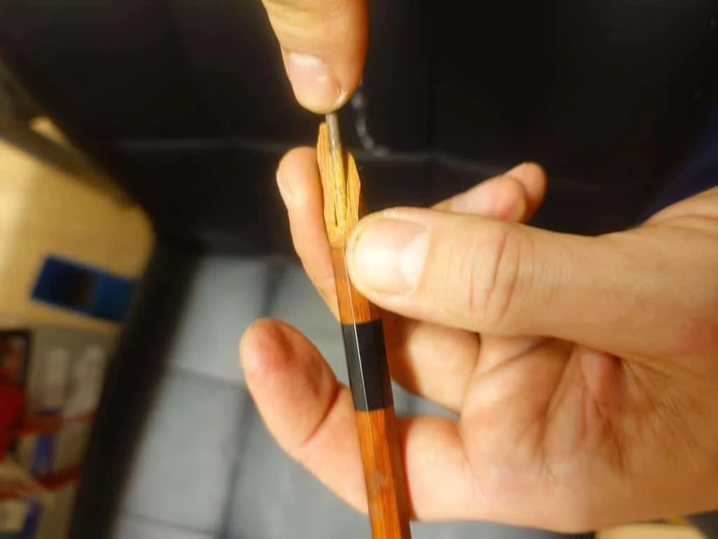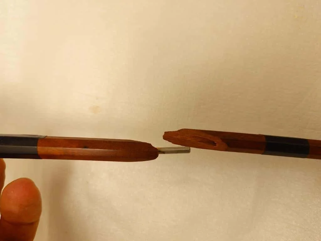 To securely reconnect and reinforce the broken stick, we decided to install a strong metal pin inside the bow stick.