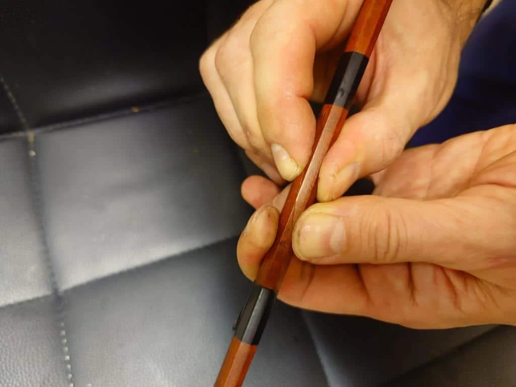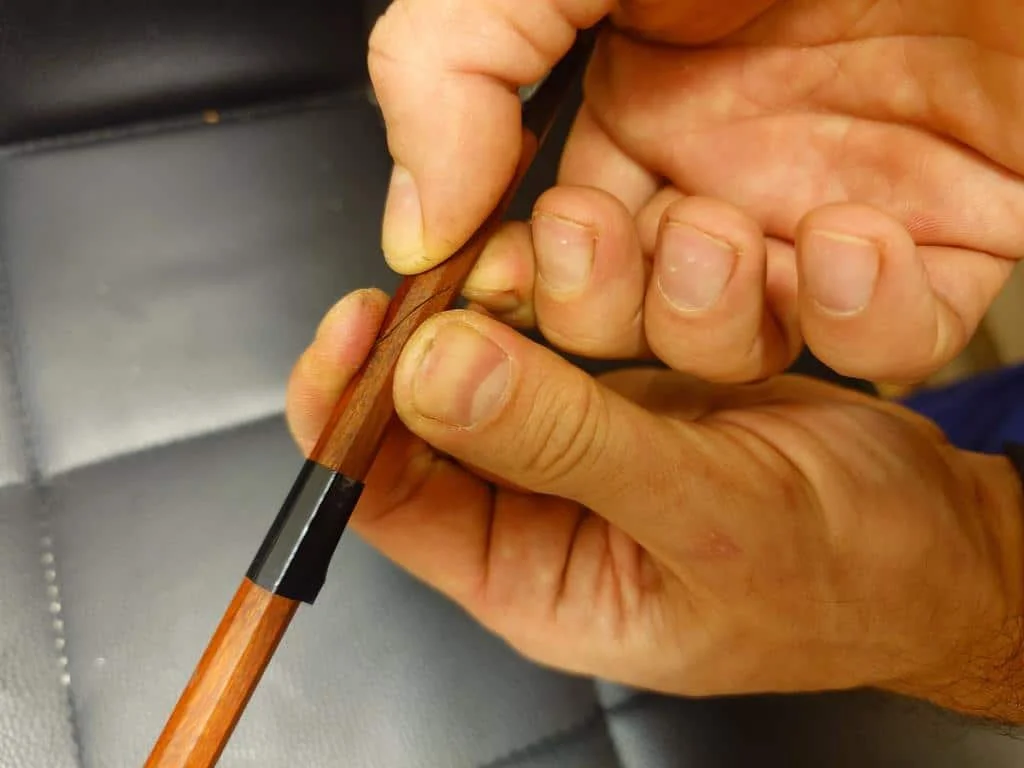 This step requires absolute precision to preserve the bow’s straightness and balance.