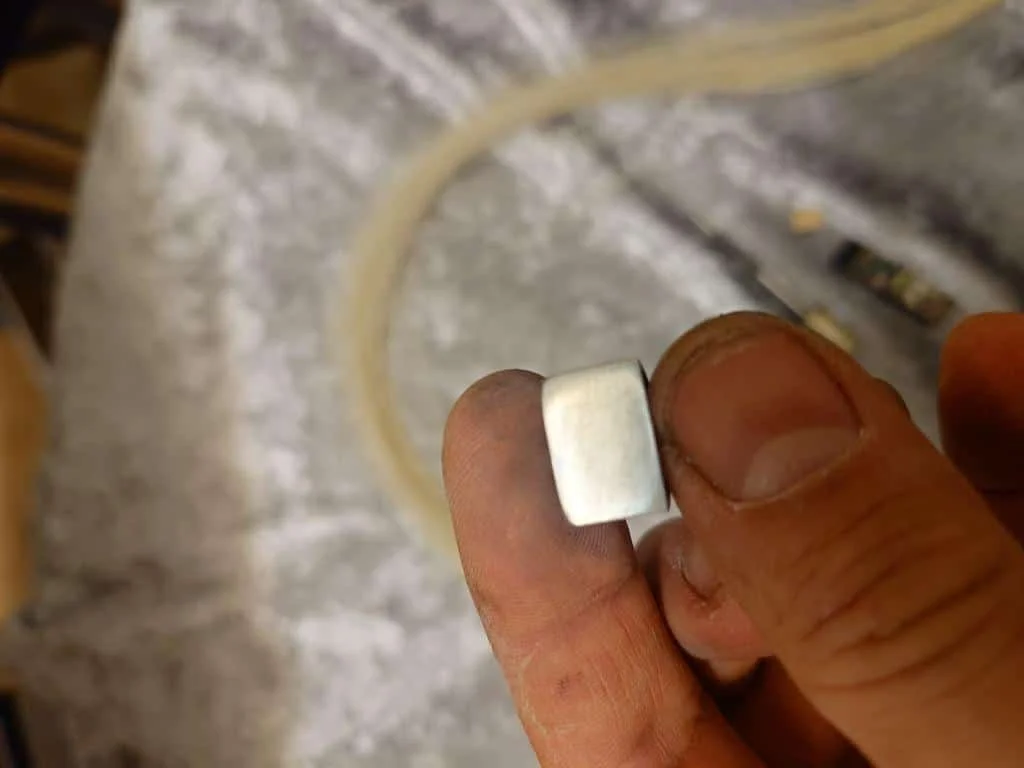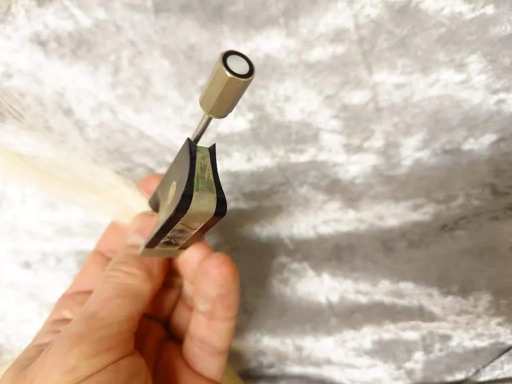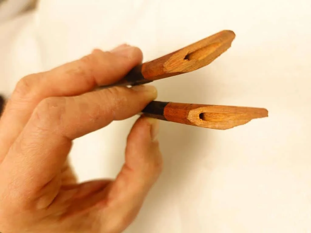 To improve adhesion, micro-roughening was applied to the surface of the pin, increasing grip between the metal and the pernambuco wood.