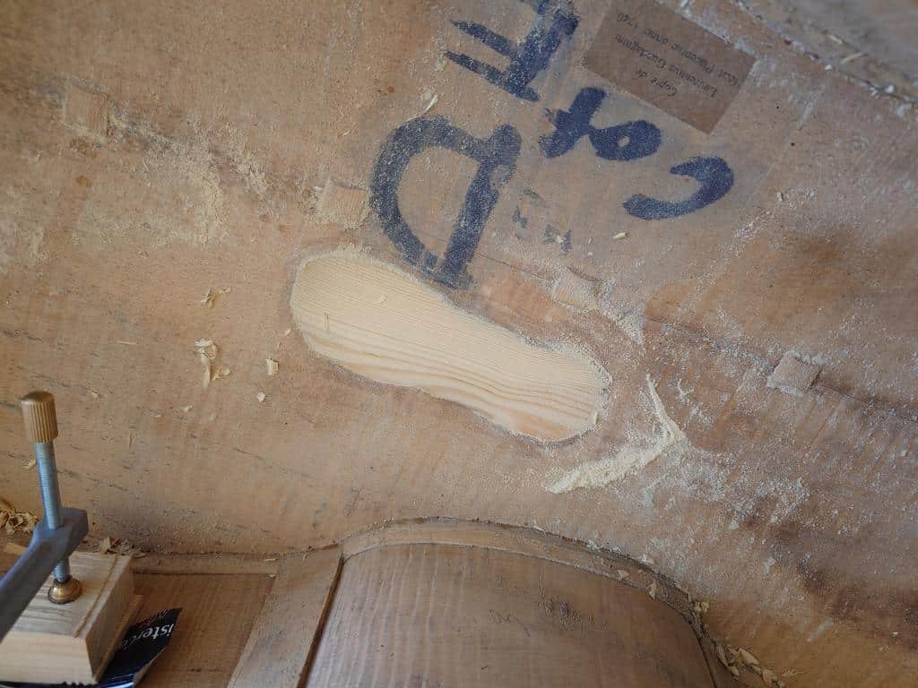 Crack on the back body at the sound post, caused by an oversized sound post.