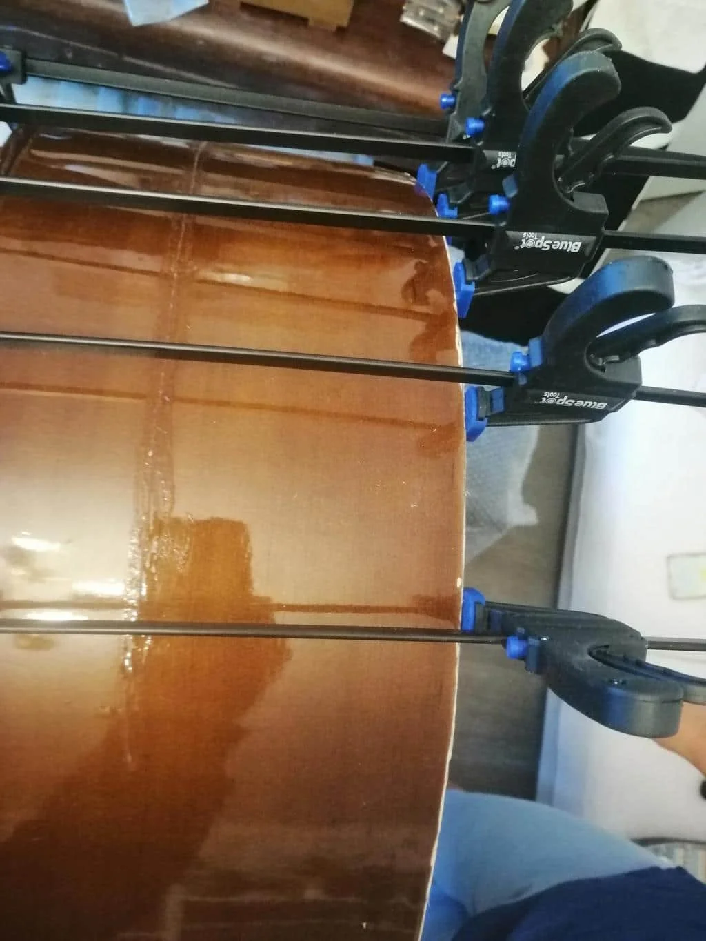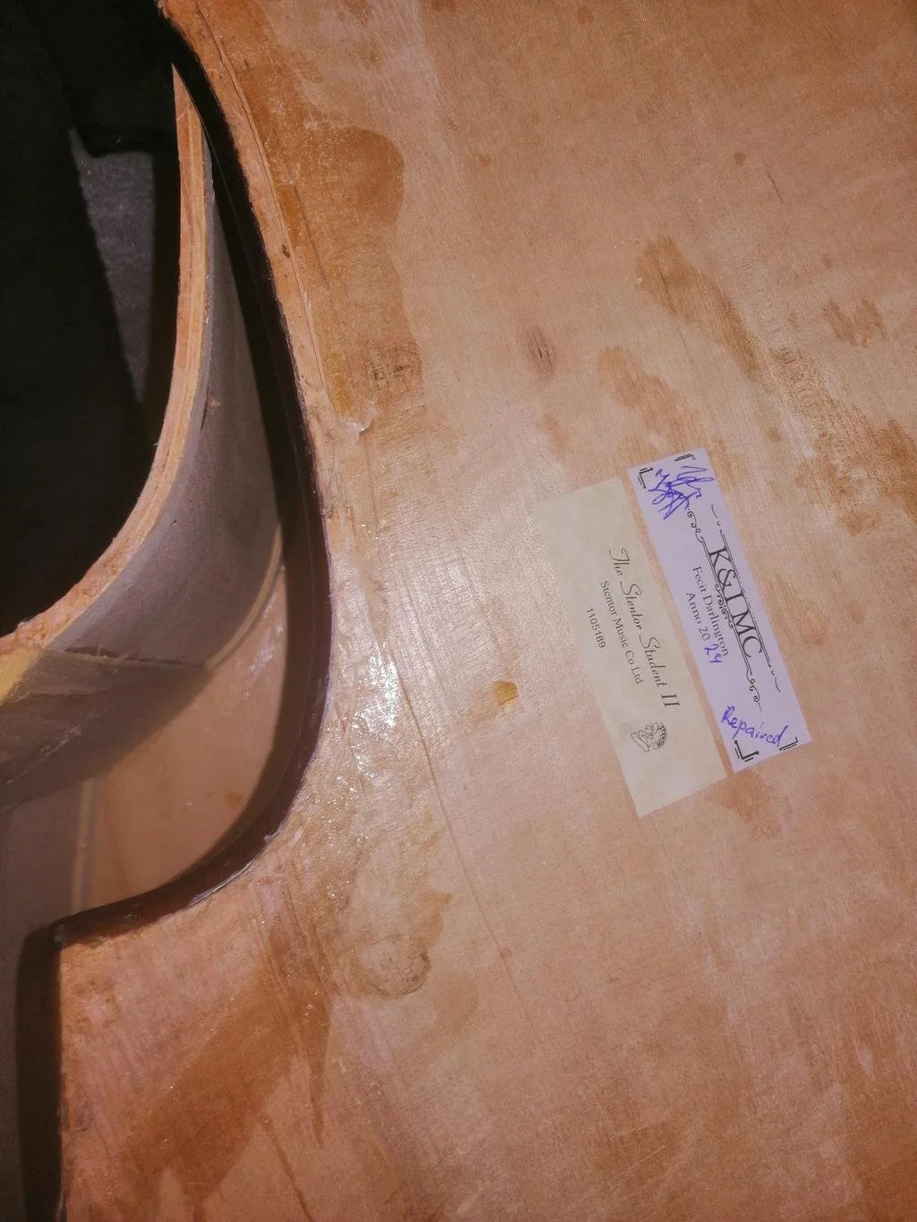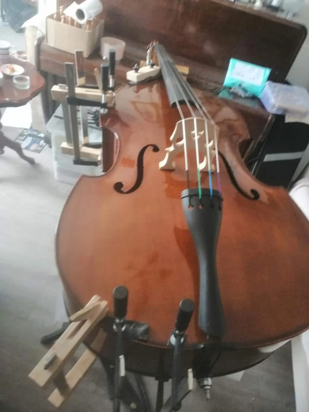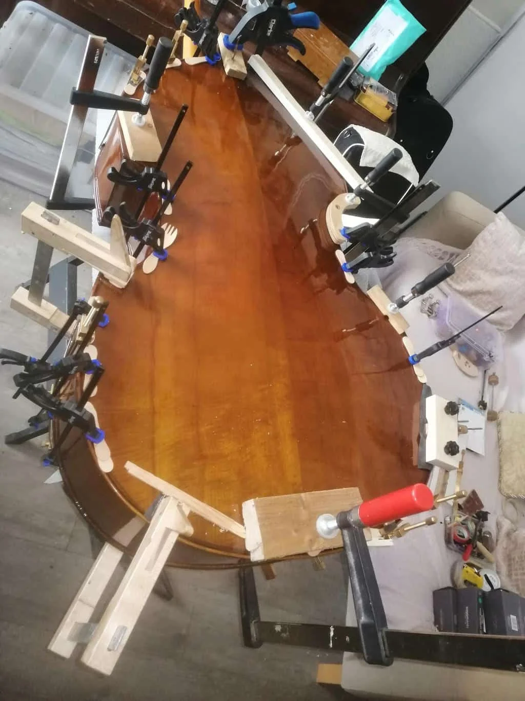 The double bass body was then carefully glued back together, restoring the instrument’s original structure and strength.