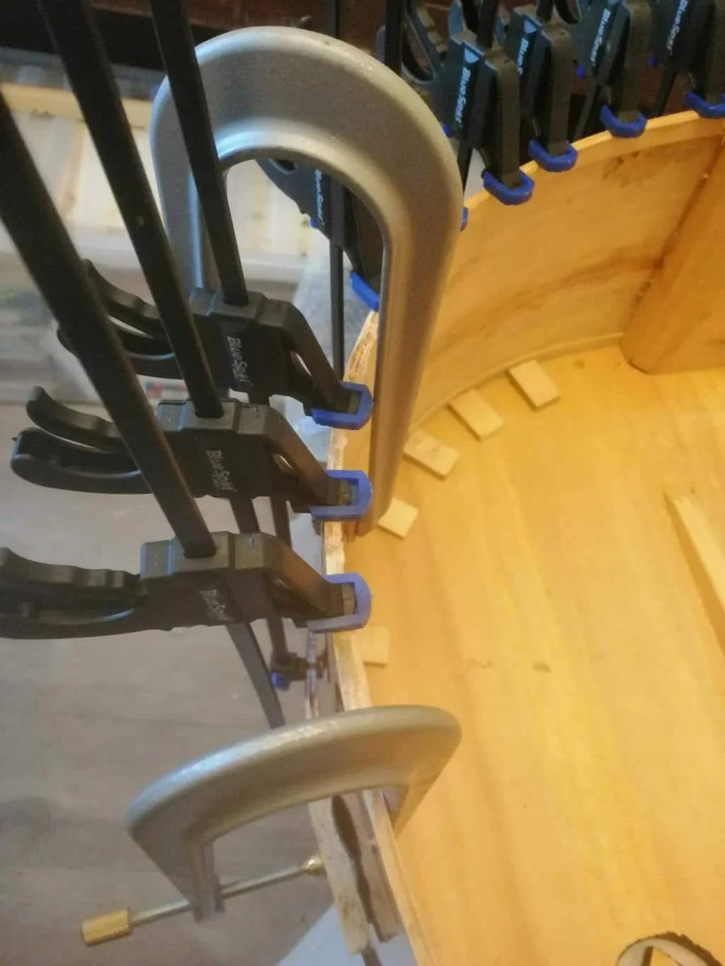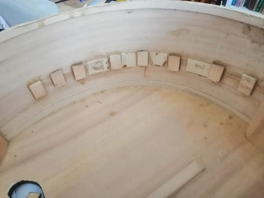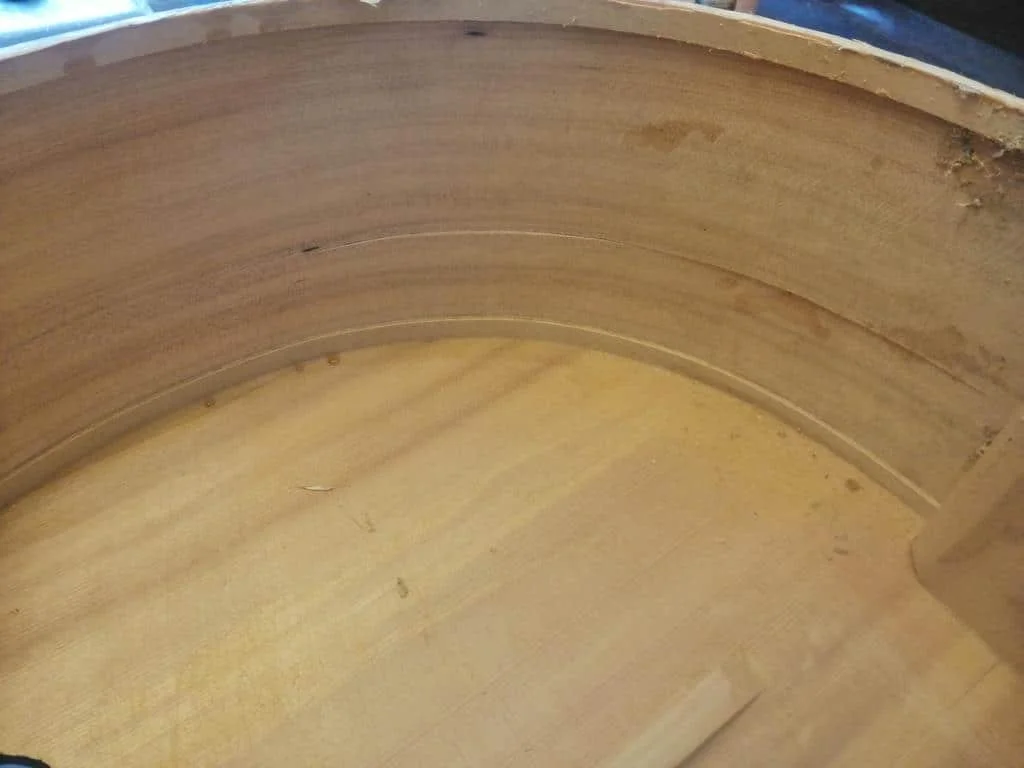 Once the glue had fully cured, the clamps were removed. The internal patches were carefully shaped and smoothed using two specialized luthier planes, ensuring clean workmanship and minimal impact on the instrument’s resonance.