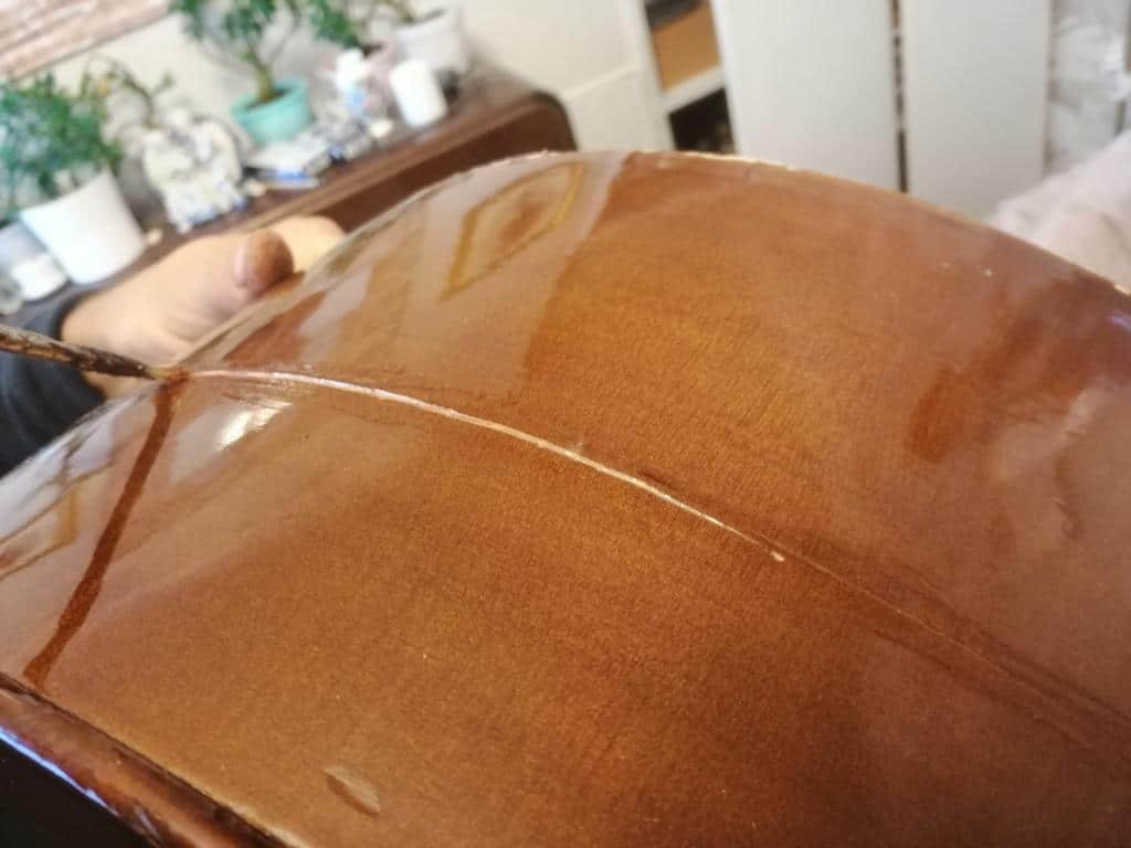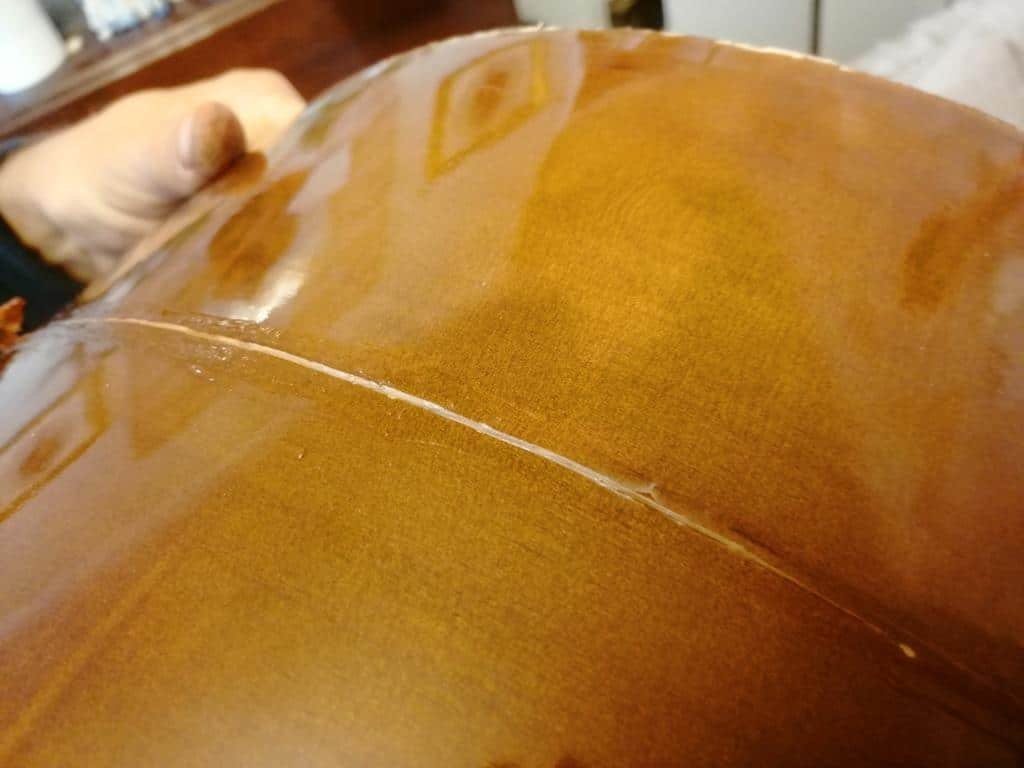 Natural traditional hide glue was applied to the rib crack. This type of glue is essential in instrument restoration, as it remains reversible and acoustically appropriate.